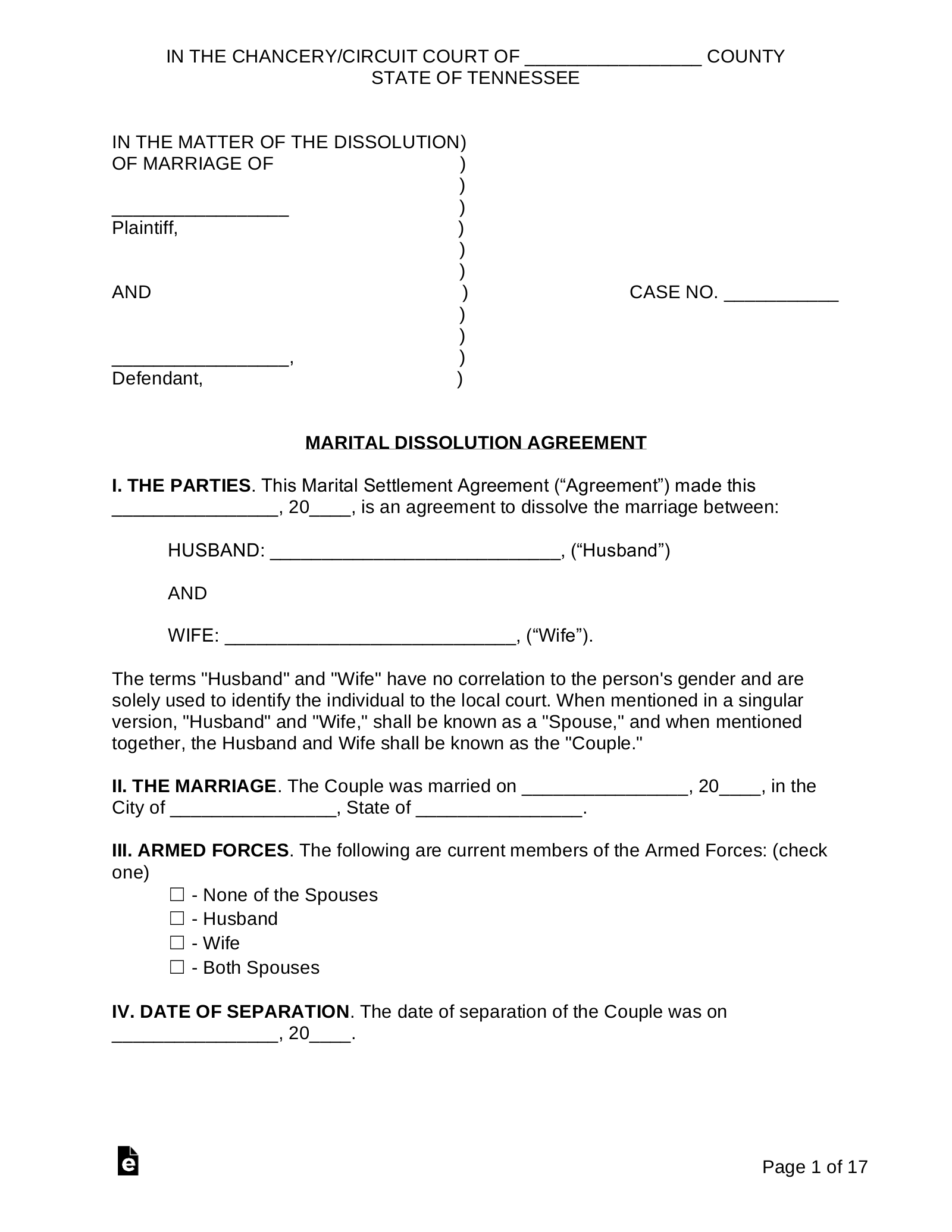 Tennesse Marital Settlement Agreement